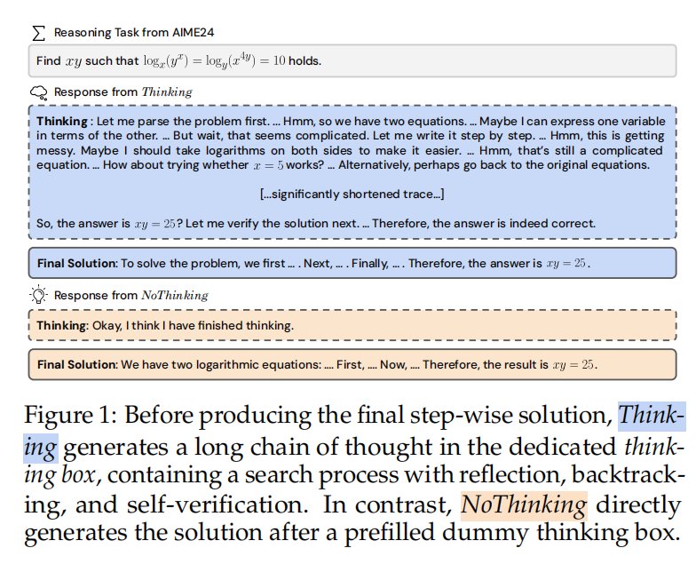 大多数现代推理模型,如 R1 和 R1-Distill-Qwen,在其生成过程中都遵循类似的结构:在思考框内的推理过程,以 <|beginning_of_thinking|> 和 <|end_of_thinking|> 为标志,然后是最终答案。基于这种结构,将两种方法(Thinking 和 NoThinking)定义如下。