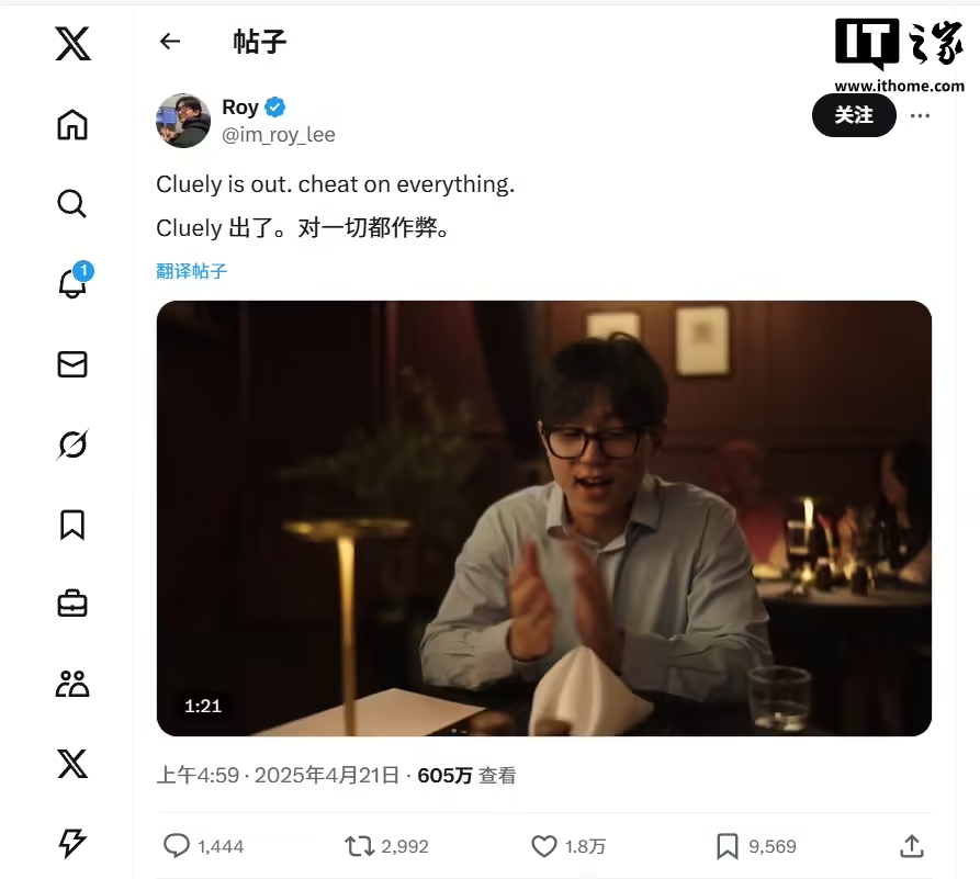 4 月 22 日消息,据外媒 TechCrunch 报道,当地时间上周日,年仅 21 岁的 Chungin「Roy」Lee 宣布,其初创企业 Cluely 完成 530 万美元(IT 之家注:现汇率约合 3867.4 万元人民币)种子轮融资,投资方包括 Abstract Ventures 和 Susa Ventures。这家位于旧金山的公司主打一款 AI 工具,号称可让用户「在所有场景中作弊」。