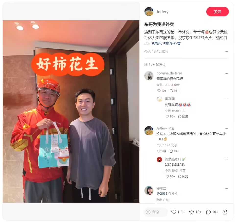 Jeffery 配文表示,「接到了东哥送的第一单外卖,荣幸啊,也算享受过千亿大佬的服务啦,祝京东生意红红火火,蒸蒸日上!」
