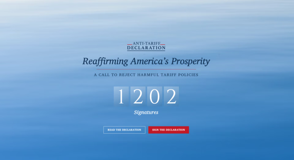 宣言写道,「关税的支持者将这些措施描述为『经济解放』行为。但其实,关税颠覆了曾引领美国主导的自由与繁荣时代的自由原则。」