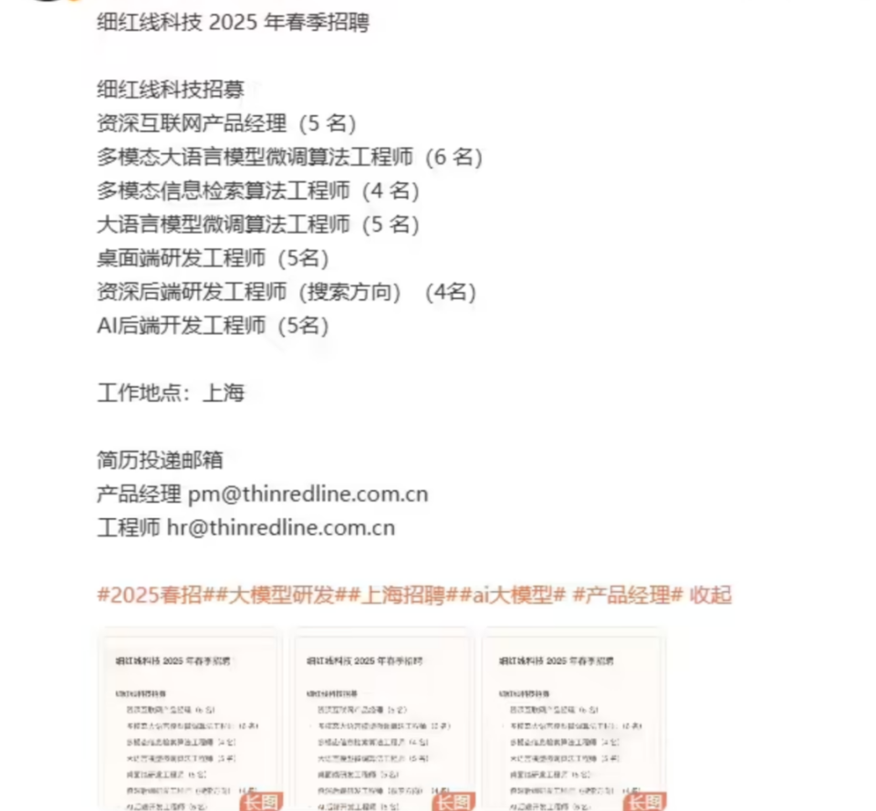 该消息传出后,罗永浩今天在社交平台上发布了细红线科技 2025 年春季招聘的多个岗位,主要分为产品经理和工程师两个方向。