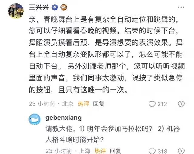 王兴兴表示,舞蹈演员摸着 H1 的后颈下台,是导演想要的表演效果,并表示「舞台上全自动复杂变队形都可以了,怎么可能不能自动下台?」