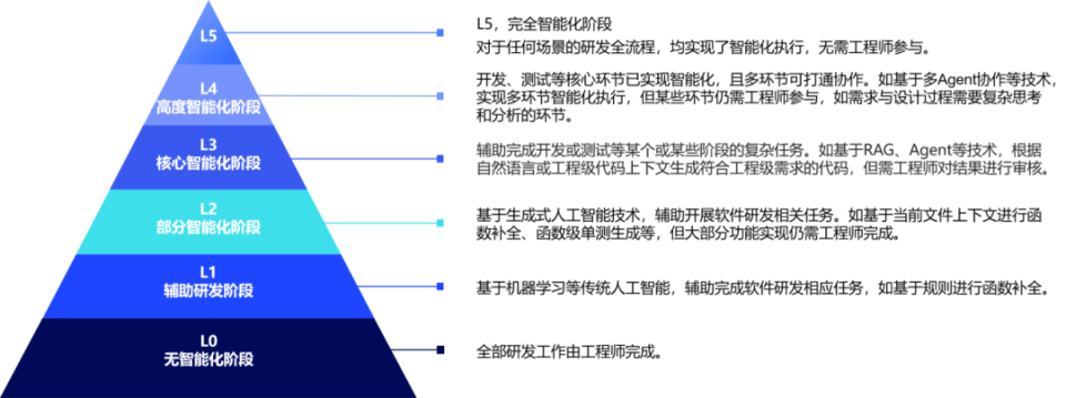 中国信通院对企业软件研发智能化成熟度进行了定义,受访企业认为内部智能化成熟度处于 L2(部分智能化)的占比最高,达到 39.15%,L3 核心智能化达到 17.62%,L4 高度智能化达到 8.98%,L2、L3、L4 合计占比为 65.75%。这表明以大模型为核心的人工智能技术在软件工程中的落地,已从概念验证阶段逐步进入规模化落地阶段,但绝大部分企业的软件研发智能化成熟度离完全智能化仍有较长距离。