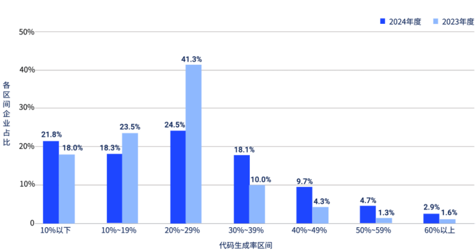 受访企业应用智能开发工具后,2024 年度通过 AI 生成的代码占全部代码的比例平均为 28.17%,相比 2023 年明显提升 6% 左右。2024 年度代码生成占比 4 大于 30% 的企业比例同比增长近一倍,达到 34%。其中,代码生成占比处于 30% 至 39% 区间的企业比例增长近 8%,这说明部分企业正加速探索和落地 AI 协作模式。值得注意的是,2023 年度 41.3% 的企业中代码占比处于 20%~29% 区间,而 2024 年度此区间的企业占比大幅收缩至 24.5%,从而向更高比例区间渗透。