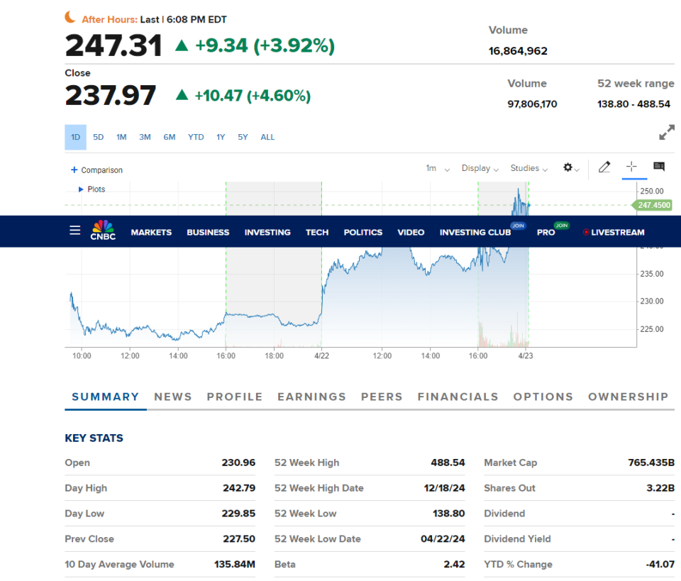 美国当地时间周二,特斯拉股价在纳斯达克证券市场常规交易中上涨10.47美元,涨幅为4.6%,报收于每股237.97美元。截止发稿,该股在盘后交易中继续上涨近10%,目前每股价格为247.31美元。
