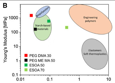 另外,这些材料还可以合成具有可编程的机械性能。例如,软质且柔韧的材料可以通过环氧化大豆油丙烯酸酯合成,而较硬的材料则可以通过更短、且具有双功能性的嵌段合成,热塑性材料则可以使用聚乙二醇甲基醚甲基丙烯酸酯合成。