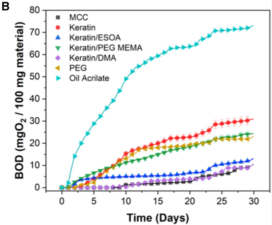 通过在海水中进行生化需氧量(BOD,biochemical oxygen demand)测试,研究人员评估了工程化角蛋白及其合成所用构建单元的生物降解性。