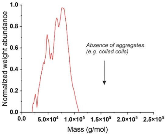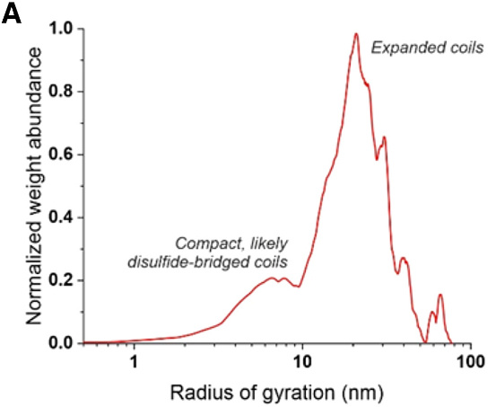 由于发生了亚硫酸盐解作用,因此角蛋白在溶液中的结构也发生了显著变化:通过使用碘乙酰胺淬灭巯基并避免二硫键介导的再聚集,研究团队观察到在提取过程中角蛋白的尺寸开始增加,但是分子量并未出现增加,这可能是因为部分卷曲螺旋形态的丧失所导致的。