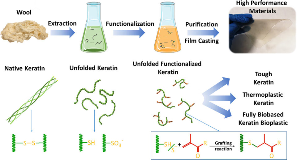 据该课题组所知,这是业内首次以这种方式针对角蛋白进行改性,通过此他们生成了一种结构为蛋白质与合成聚合物混合物的分子。