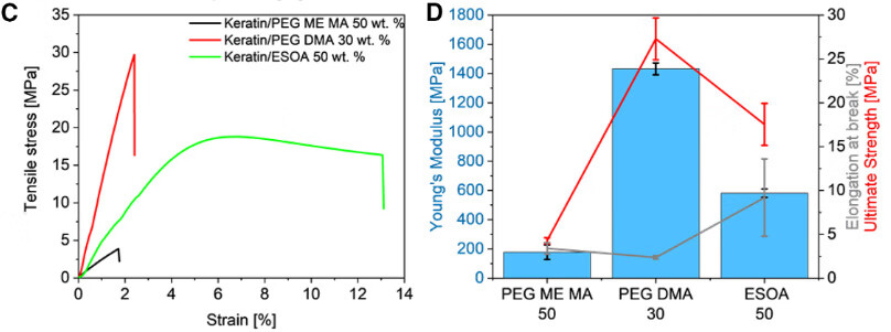 在下图中,研究团队比较了用聚乙二醇甲基丙烯酸酯、聚乙二醇二甲基丙烯酸酯和环氧化大豆油丙烯酸酯(ESOA,epoxidized soybean oil acrylate)改性的角蛋白的力学性能。
