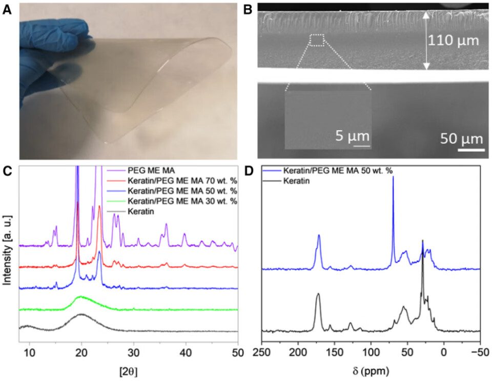 另外,工程角蛋白的结构、与两种构建块(角蛋白和聚乙二醇甲基丙烯酸甲酯)之间的相互作用,能够产生一种令人惊讶的新特性。