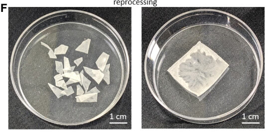 如下图所示,工程角蛋白可以像热塑性材料一样进行再加工。当将含有 50% 重量百分比的聚乙二醇甲基醚甲基丙烯酸酯的角蛋白基薄膜的小碎片放在在 80℃ 下,以 10 吨的压力压缩成型 20 分钟,即可获得一种新的连续型材料。