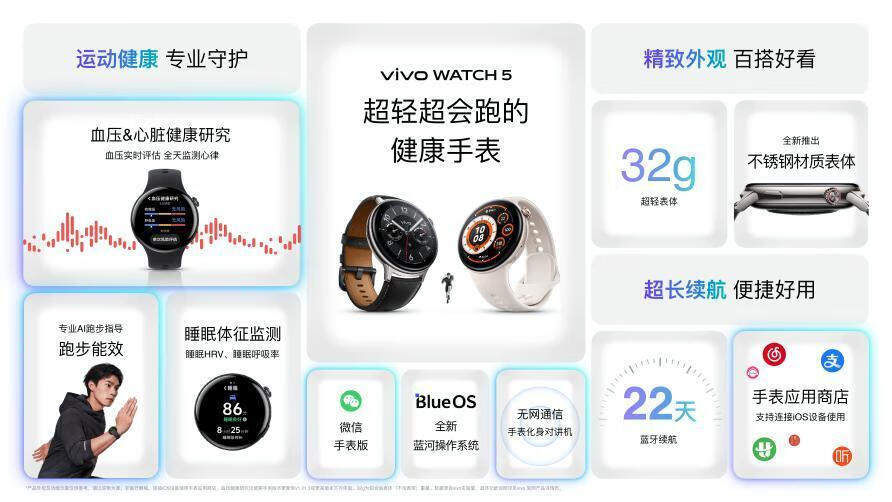 “超轻超会跑”的智能穿戴新品vivo WATCH 5,不仅搭载专业AI跑步指导,还有无感血压风险评估,刷新专业运动监测与健康监测的新高度。凭借其最低仅32g的超轻量级金属机身,至长22天蓝牙续航,为用户带来全场景、高品质的腕上智慧体验。vivo WATCH 5已在vivo官网及各大电商平台开启预售,并将于4月29日正式开售,价格799起。首销期间在各大电商平台购机可享国补优惠,低至679.15元起。
