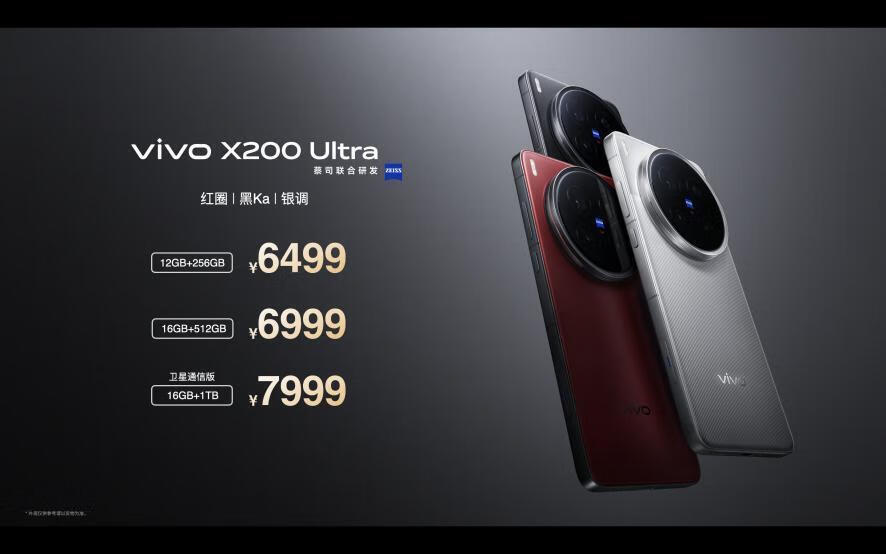两款新品价格在此次发布会上公布,其中vivo X200 Ultra有12GB+256GB版本、16GB+512GB版本和16GB+1TB卫星通信版,售价分别为6499元、6999元和7999元,另外X200 Ultra 1TB 摄影师套装售价9699元。