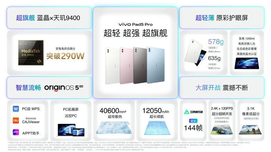 vivo Pad5 Pro作为“安卓超旗舰性能平板”,搭载安卓平板全球首发的蓝晶×天玑9400芯片,安兔兔综合跑分突破290万大关,实力演绎安卓平板性能的超强形态;再配合超轻薄原彩护眼屏,打造全场景超强显示体验。系统级蓝心大模型赋能,以及 PC 级 WPS 等专业适配,是大屏移动游戏与轻办公生产力的新选择。vivo Pad5 Pro已在vivo官网及各大电商平台开启预售,云霞粉、春潮蓝、与寒星灰三种配色将于4月25日正式开售,价格2999元起;vivo Pad5 Pro超轻版轻羽白配色将于4月29日限时开售。首销期间在各大电商平台购机可享国补优惠,低至2549.15元起。