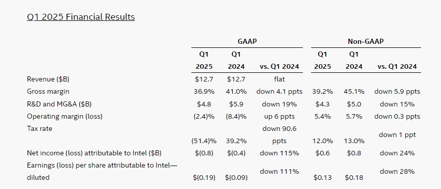 英特尔新帅上任首考:Q1营收127亿美元,净亏损8亿美元,盘后跌5%