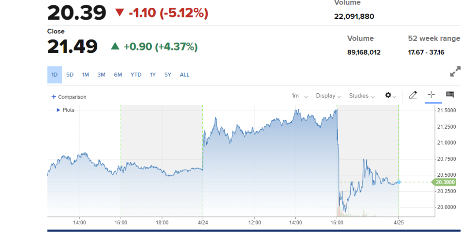 美国当地时间周四,英特尔股价上涨0.9美元,报收于每股21.49美元,涨幅为4.37%。截止本文发稿,该股在盘后交易中下跌逾5%,目前交易价格为每股20.39美元。