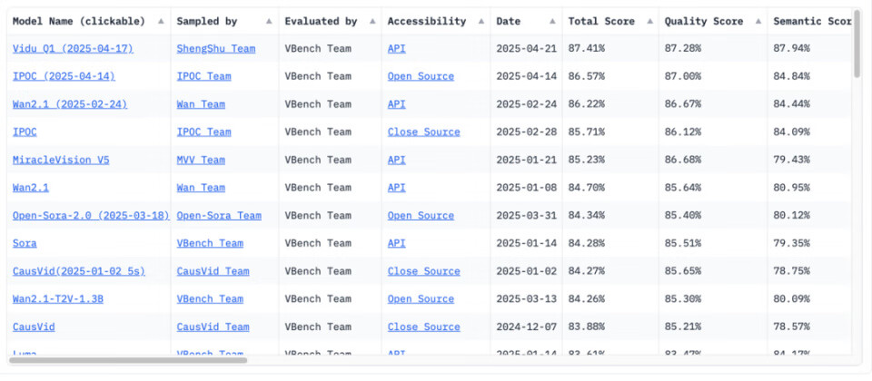 图丨 V-Bench 1.0 榜单(来源:Hugging Face)