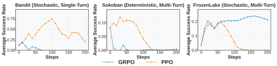 值得注意的是,研究团队观察到在发生性能退化之前,StarPO 的近端策略优化(PPO,Proximal Policy Optimization)变体比梯度惩罚策略优化(GRPO,Gradient Penalty Policy Optimization)变体,能够保持更长的稳定时间。