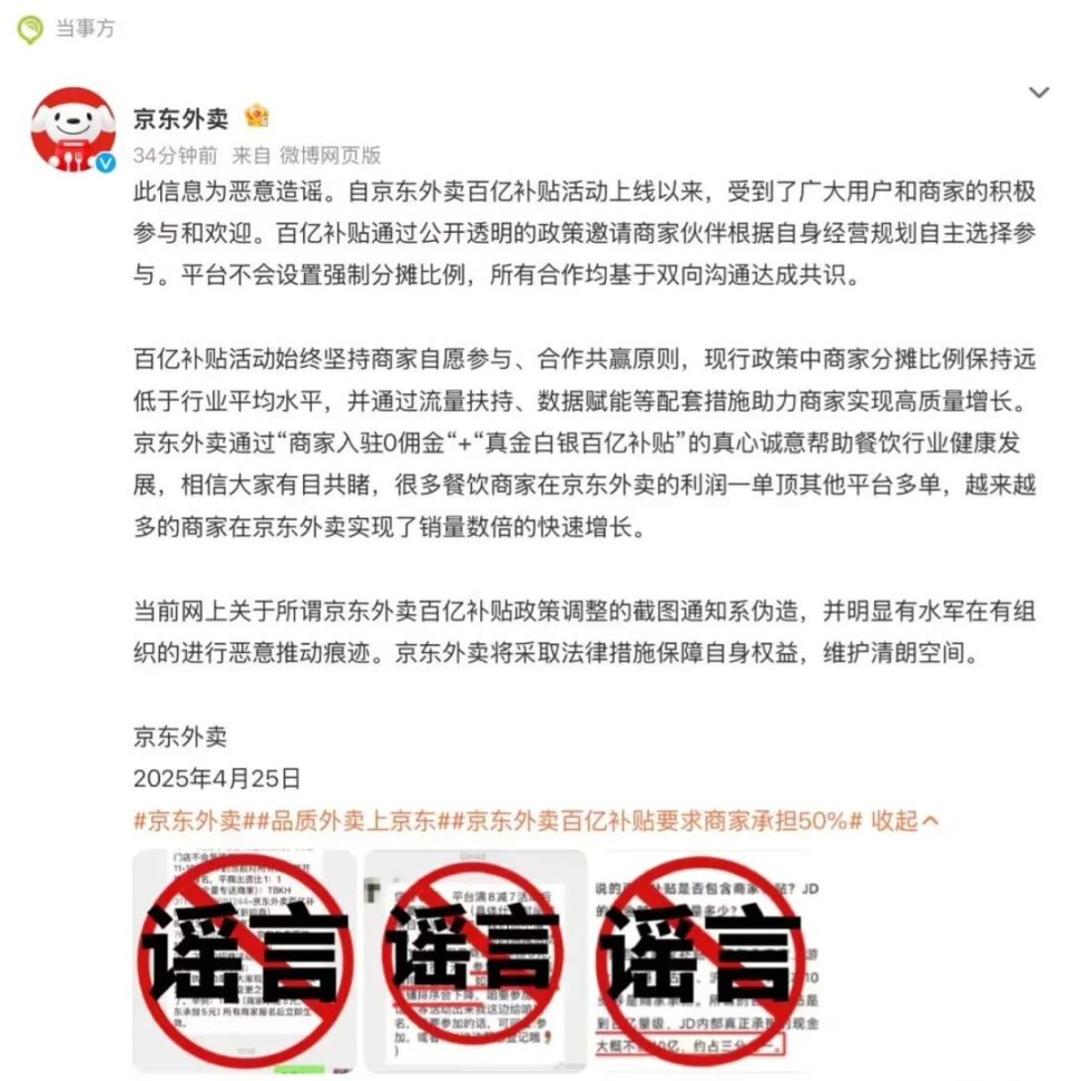 京东外卖辟谣补贴要求商家承担 50%:恶意造谣,不会设置强制分摊比例