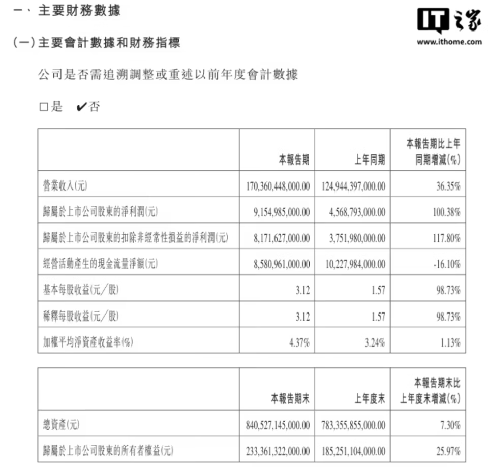 比亚迪 2025 年第一季度净利润 91.55 亿元,同比增长 100.38%