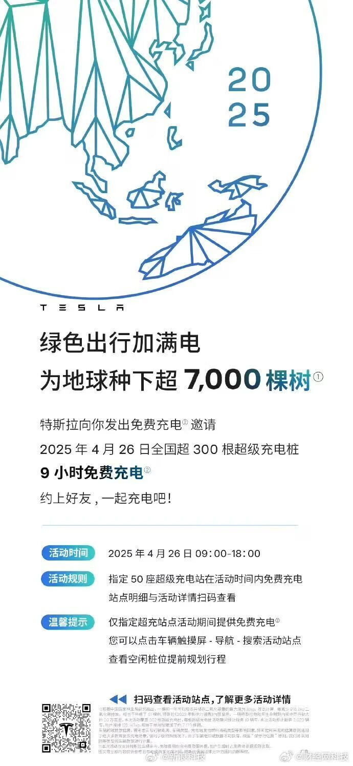 特斯拉今日宣布,4 月 26 日 9:00-18:00,特斯拉将开启 9 小时免费充电福利,覆盖全国 50 座站点、超 300 根超级充电桩。