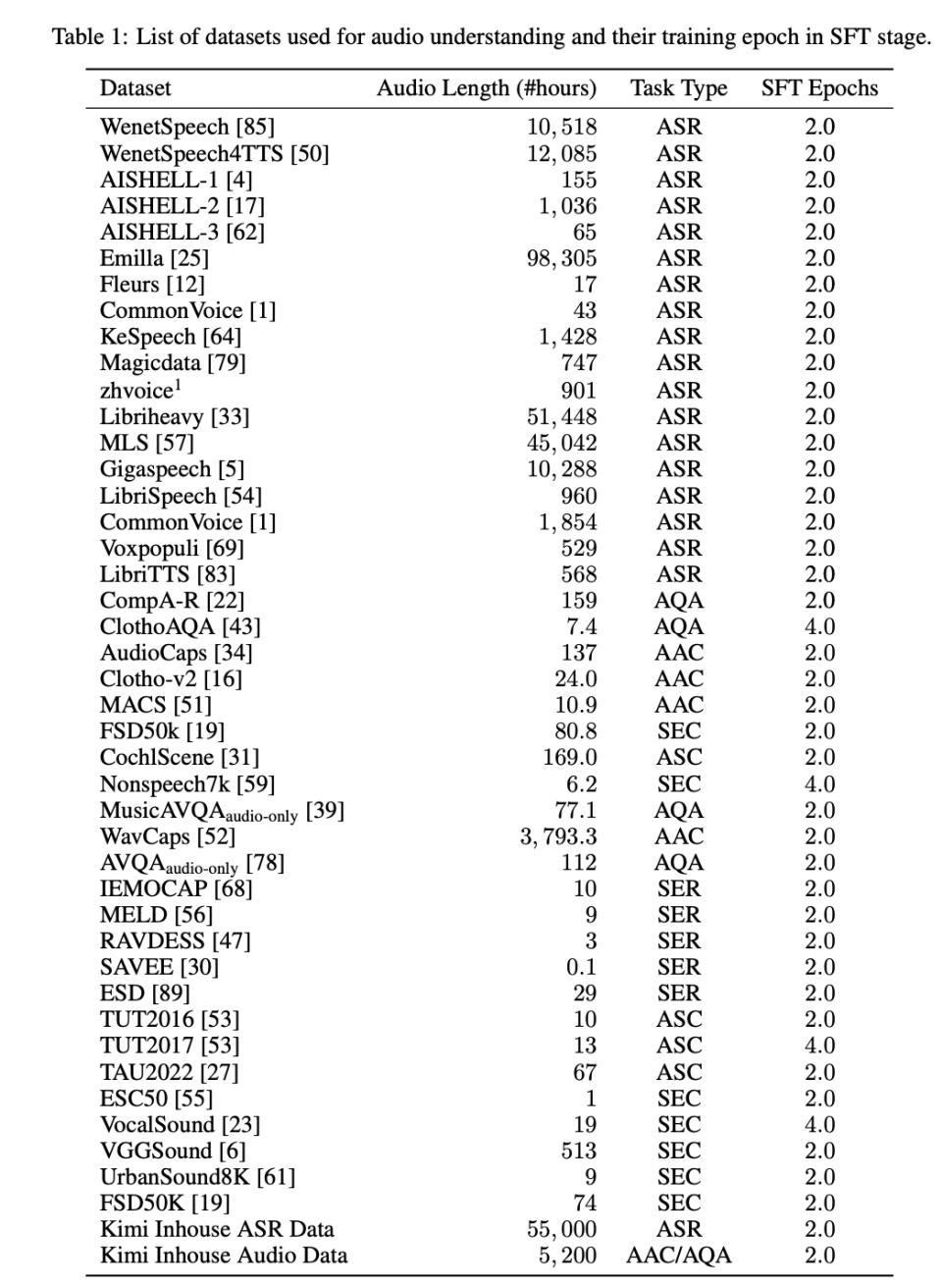 考虑到下游任务的多样性,研究者没有设置特殊的任务切换操作,而是为每个任务使用自然语言作为指令;对于指令,他们构建了音频和文本版本(即音频由 Kimi-TTS 在零样本方式下基于文本生成),并在训练期间随机选择一种;为了增强遵循指令能力的鲁棒性,他们使用大语言模型为 ASR 任务构建了 200 条指令,为其他任务构建了 30 条指令,并为每个训练样本随机选择一条。他们构建了大约 30 万小时的数据用于监督式微调。