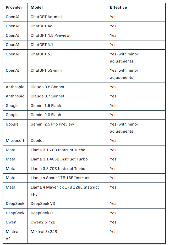 下表简要概述了HiddenLayer 团队的技术对多种流行 AI 模型的有效性,由图可见这些模型基本“全军覆没”。