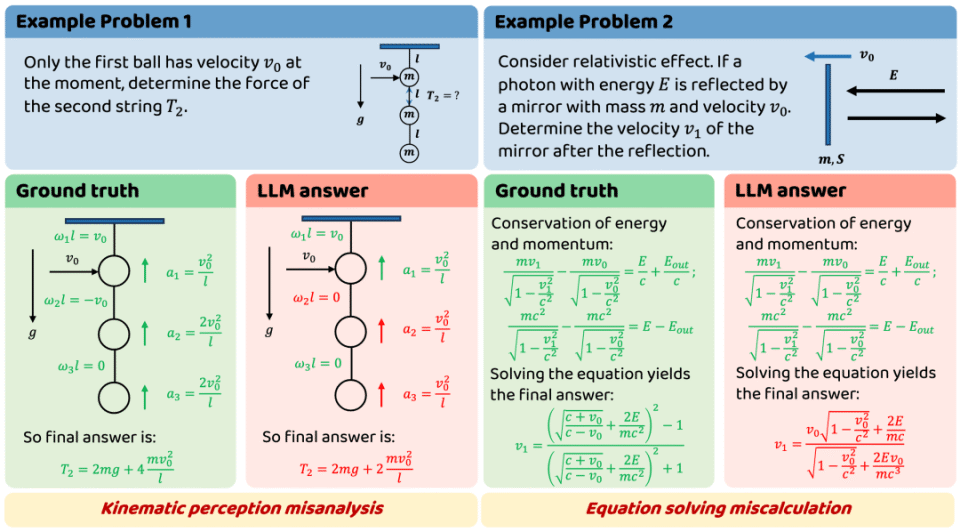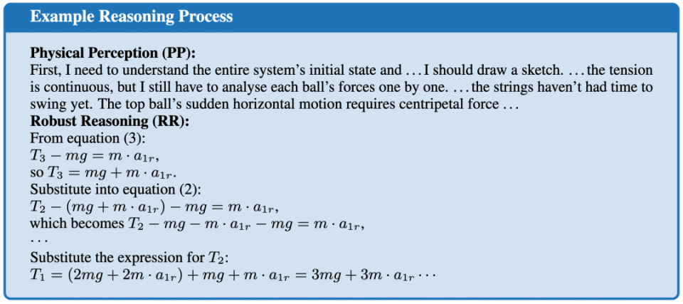 物理感知(PP):在此阶段,模型进行密集的文字推理,模型需要识别问题相关的物理对象、变量和动力学关系,定性判断哪些物理效应是重要的,哪些可以忽略不计。若 PP 出错,后续整个推理都会偏离轨道。(示例 1 展示典型 PP 失误)