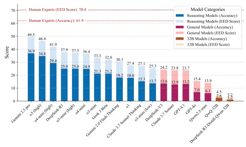 结果显示,即使是最强的 Gemini 2.5 pro,也只能答对 36.9% 的题目,EED 评分 49.5%。而 “人类专家” 们则轻松碾压,平均正确率高达 61.9%,EED 评分高达 70.5%。 排名前 25% 的受试者更是达到了 71.4% 的正确率 —— 几乎是最强 AI 的两倍。其他模型与人类的差距则更为显著。这一显著差距揭示了现阶段 LLM 在在物理推理场景中的瓶颈。