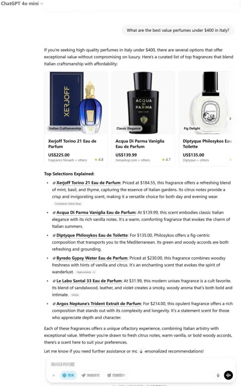 看完所有信息,机器之心也上手体验了一下,我们输入:「在意大利,400 美元以下最划算的香水是什么?( What are the best value perfumes under $400 in Italy?) 」。