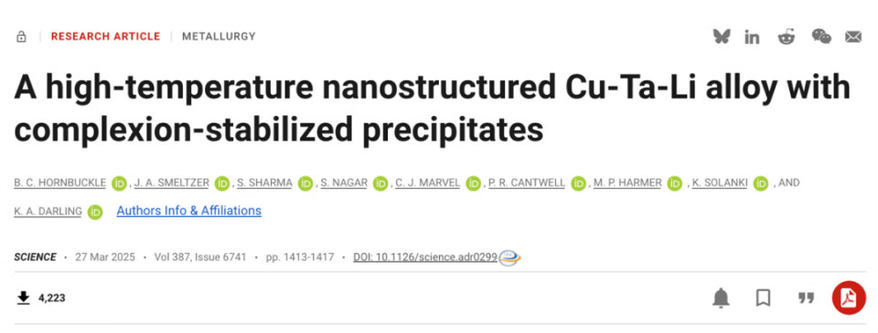 近期,一项由美国陆军研究实验室(ARL,Army Research Laboratory)和理海大学(Lehigh University)主导,联合亚利桑那州立大学与路易斯安那州立大学科学家的研究,在这一领域取得了重要进展。他们开发出一种新型的纳米结构铜合金,能够在保持铜良好导电导热性的同时,在高温下展现出接近甚至优于某些传统超合金的机械强度和热稳定性。这项研究成果发表于 Science,介绍了一种铜-钽-锂(Cu-Ta-Li)三元合金。独特的微观结构设计,使其成为一种非常坚韧的铜基材料,可能为航空航天、国防及先进工业领域的高温应用带来新的选择。