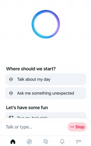 一打开应用,代表语音交互的圆环最大幅居中显示。如果授权了麦克风权限,并在设置中打开“准备好交谈”,那每次打开应用时,会默认自动开始语音对话。也就是说,一打开,收音自动开始,Meta AI就等着“听”你要说什么了。