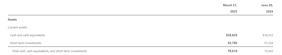 截至2025年3月31日,微软持有的现金、现金等价物和短期投资总额为796.18亿美元,而截至2024年6月30日为755.43亿美元。