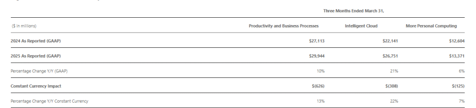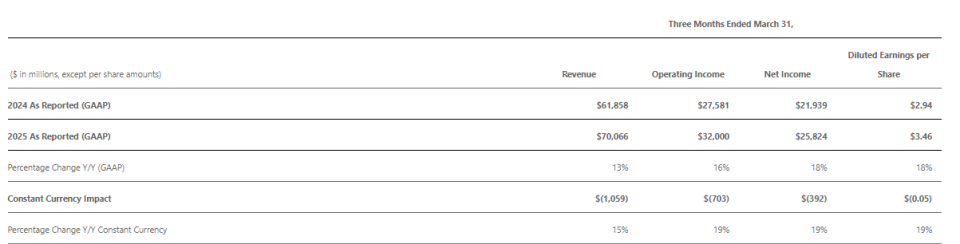 财报显示,微软第三财季营收为700.66亿美元,同比增长13%;净利润为258.24亿美元,同比增长18%,按固定汇率计算;每股摊薄收益为3.46美元,同比增长18%。