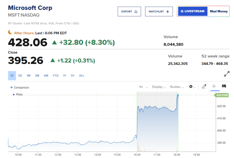 美国当地时间周三,微软股价在常规交易中上涨1.22美元,涨幅为0.31%,报收于每股395.26美元。在随后的盘后交易中,截至本文发稿时,微软股价大涨32.8美元,涨幅超过8%,目前交易价格为每股428.06美元。