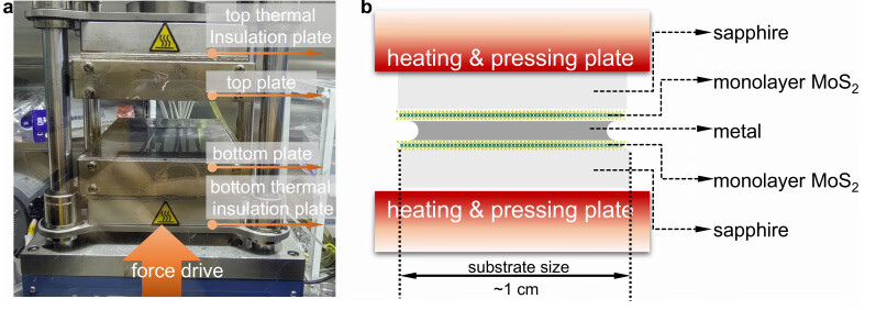 基于这一思路,研究人员开发了全新的“范德华挤压法”。该方法的核心在于利用两片单层 MoS2 覆盖的蓝宝石作为压砧,在高温高压下将熔融金属挤压成原子级厚度的薄膜。