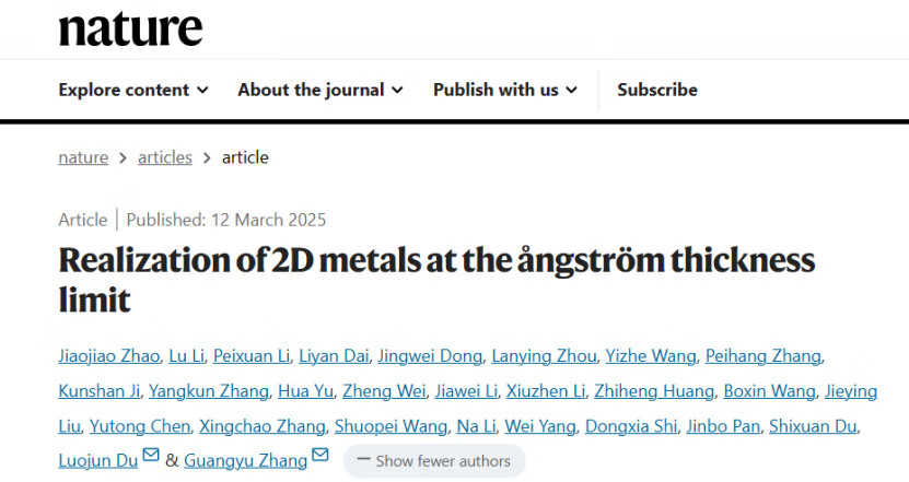 1.Zhao, J., Li, L., Li, P. et al. Realization of 2D metals at the ångström thickness limit. Nature 639, 354–359 (2025). https://doi.org/10.1038/s41586-025-08711-x