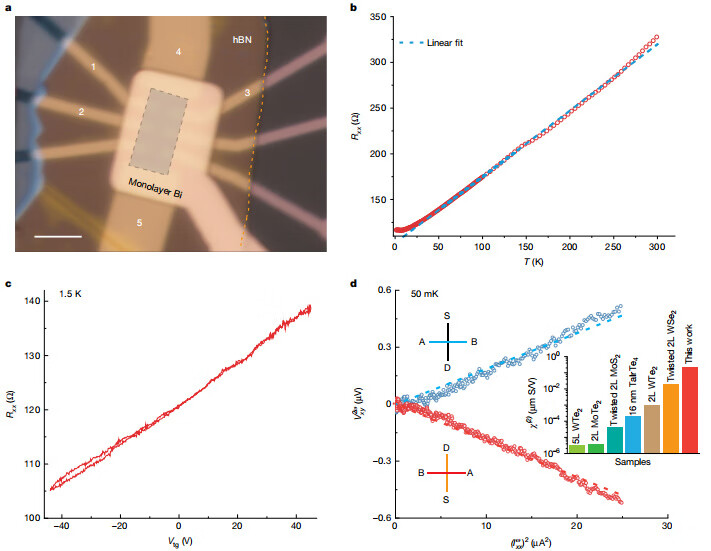 在极端低温条件下(50mK),单层铋展现出约 0.22μm·S/V 的非线性霍尔电导率,这一数值比已报道的其他二维材料高出两个数量级。同时,封装样品的长期稳定性测试表明,单层铋在环境中可稳定存在至少一年,展现出优异的实用化前景。