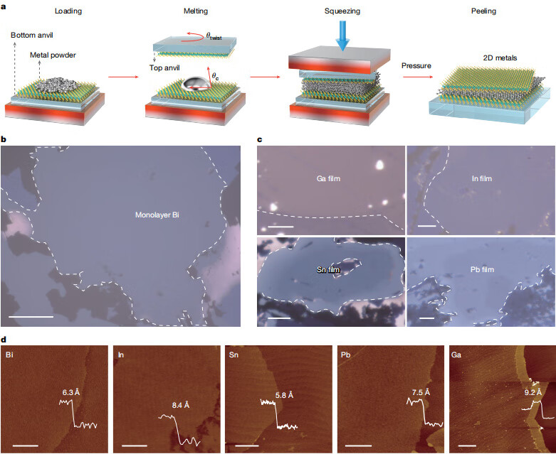 近期,中国科学院物理研究所张广宇研究员和杜罗军特聘研究员团队开发了一种名为“范德华挤压法”的原子制造新技术,成功制备出包括铋(Bi)、镓(Ga)、铟(In)、锡(Sn)和铅(Pb)在内的多种二维金属。