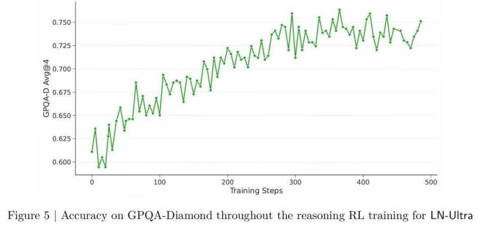 针对 LN-Ultra,研究者通过大规模强化学习提升其科学推理能力,采用 GRPO 算法。训练中设置每个 rollout 的提示词长度为 72,并为每个提示采样 16 个响应,采样参数为 temperature = 1,top_p = 1。