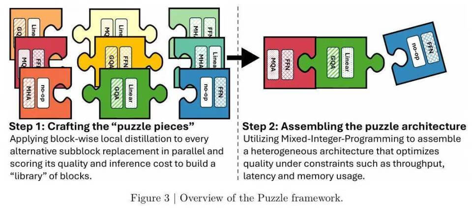 LN-Super 和 LN-Ultra 模型通过 Puzzle 框架实现高效推理优化。Puzzle 是一个神经网络架构搜索(Neural Architecture Search, NAS)框架,能够在真实部署约束条件下,将大型语言模型转化为面向硬件高效的变体,如图 3 所示。