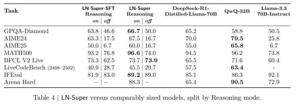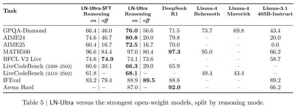 LN-Ultra 在推理类与非推理类基准测试上均达到或超越了现有开源权重模型的水平(如表 5 所示),证明通过从强大教师模型中蒸馏知识,模型可通过监督微调获得较强能力。