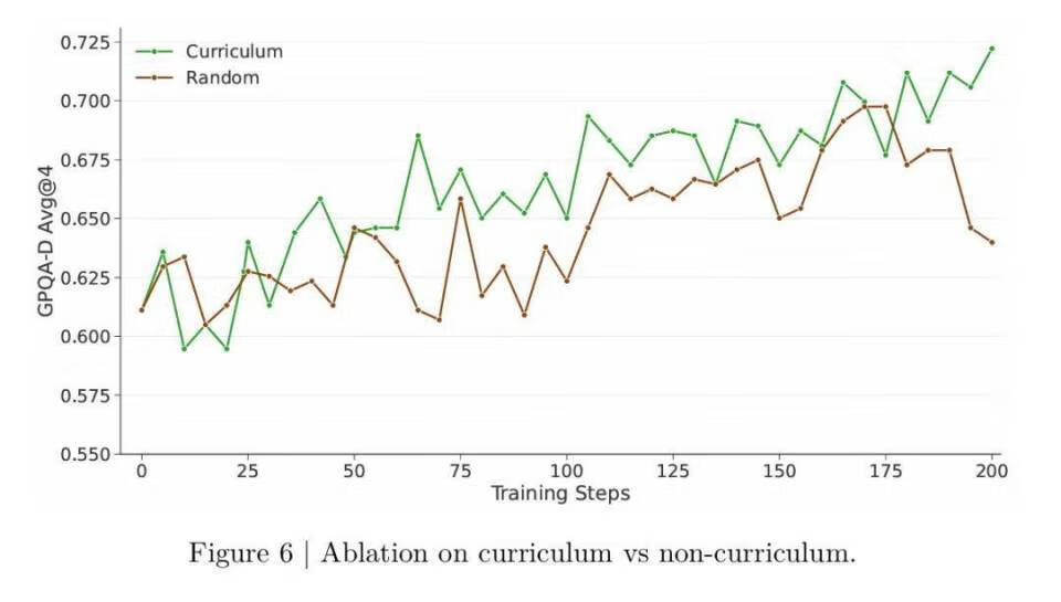 这种策略确保样本难度在 batch 层面逐步递进,同时 batch 内部保持随机性。图 6 展示了该课程式学习策略在降低方差、稳定训练过程及提升准确率方面的有效性。