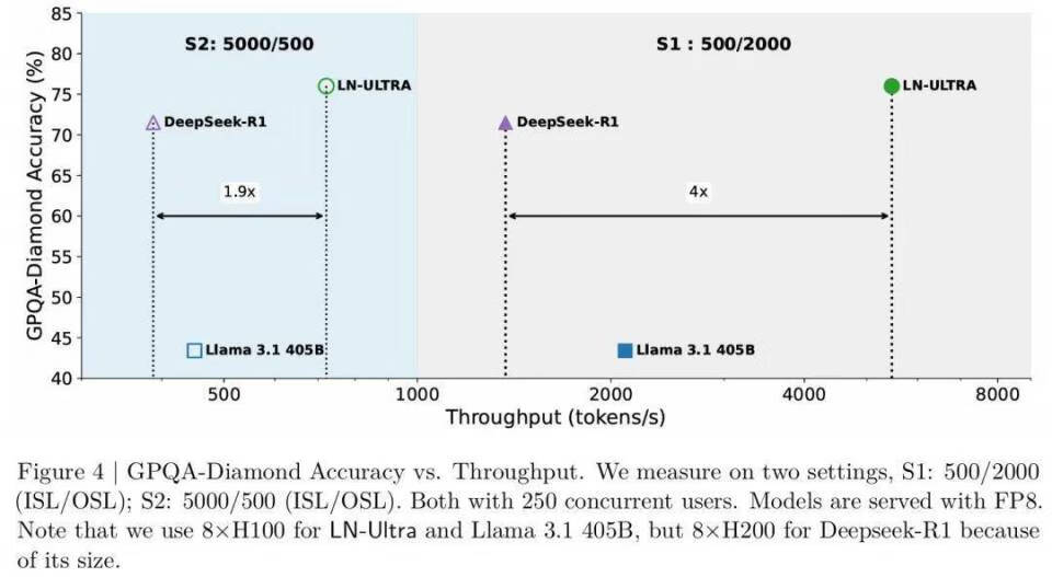 图 4 展示了两种设置下 GPQA-Diamond 准确率(%)与处理吞吐量(Token/s)的权衡曲线。值得注意的是,LN-Ultra 在准确率和效率方面均优于 DeepSeek-R1 和 Llama 3.1-405B,表明在精度 - 吞吐率帕累托曲线(accuracy-throughput Pareto curve)上,LN-Ultra 是更具优势的选择。