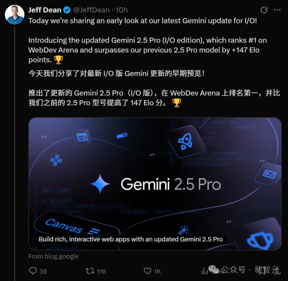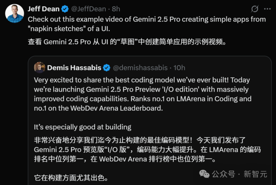 谷歌首席科学家、Gemini的负责人Jeff Dean也连发数条推文来介绍更新后的Gemini 2.5 Pro,足见对其性能的信心。
