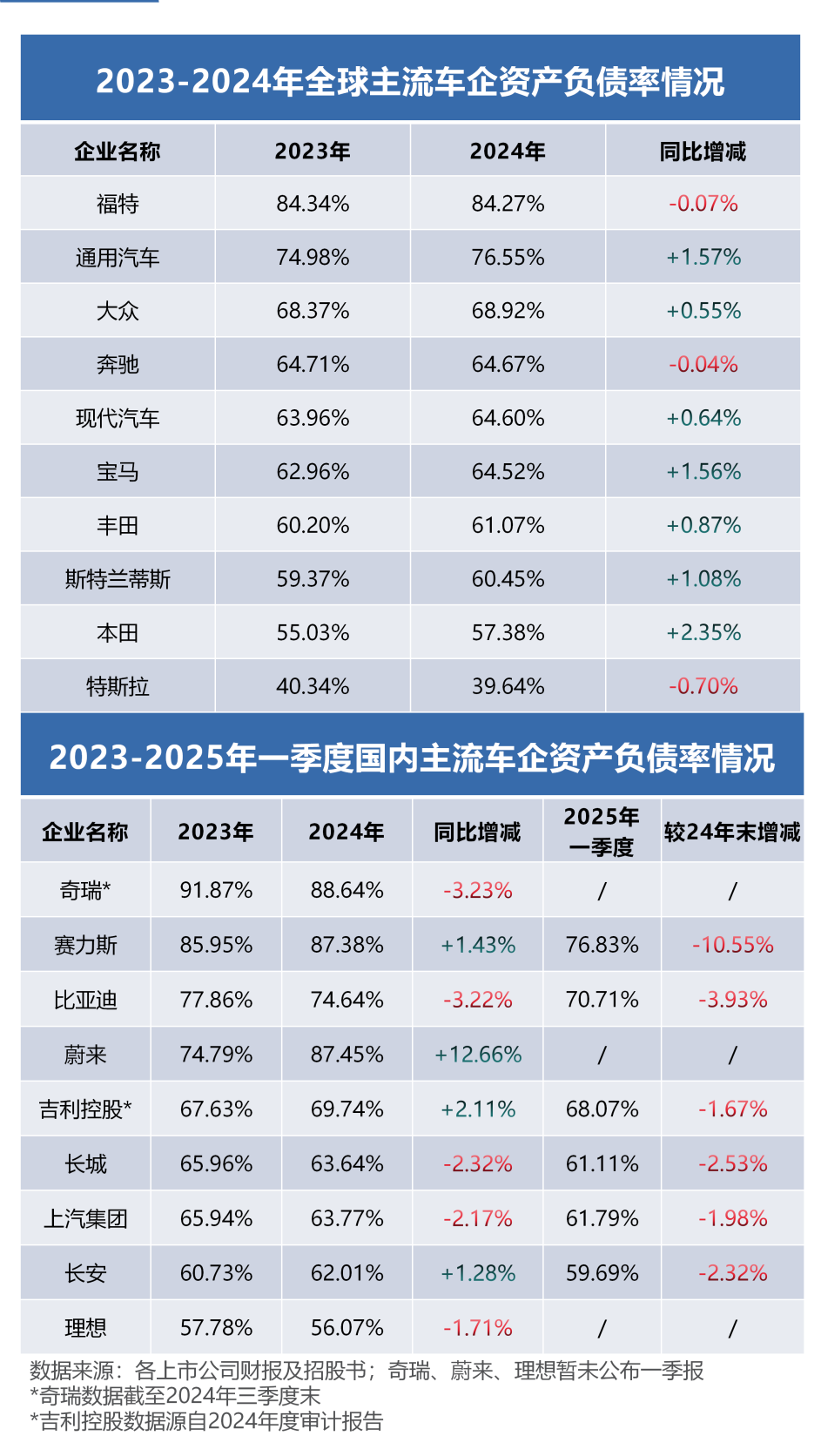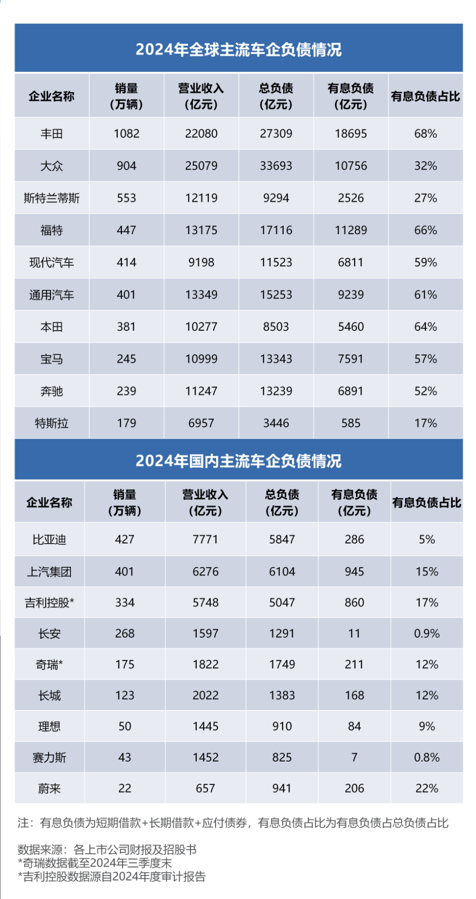 极客公园 发布于 2025-05-09 19:16:58 透视 2024 全球车企:谁家底更厚,谁已开始掉队? 底层逻辑不再是大打小,而是快打慢。作者|周永亮编辑|郑玄又到了全球汽车界「放榜」时刻!就像期末要查成绩一样,随着国内外各大主流车企财报出炉,它们的「成绩单」也被曝光。刚刚过去的一年,对全球汽车产业来说是极具挑战的一年。新能源汽车狂飙突进的同时,局部市场却遭遇瓶颈,同时伴随着激烈的价格肉搏战。传统燃油车「腹背受敌」,部分区域虽有坚守,但整体结构性下滑已成定局。在这场关乎生死与未来的年度「大考」中,中外主流车企究竟表现如何?谁顶住了重重压力,稳住了阵脚?谁又开始掉队呢?01中外车企「冰火两重天」2024 年,在电动化、智能化浪潮以及价格战双重夹击下,全球主流车企的运营状况呈现出分化格局。跨国巨头普遍承压,深陷转型阵痛。除了表现相对稳健的 Stellantis,其他国外主流车企几乎都遭遇到销量下滑。其中,欧洲车企集体失速,日韩车企却呈现出一种耐人寻味的「背离」——销量和利润走向了相反的方向。与传统巨头在转型中深陷泥沼相比,中国车企交出了一份不错的年度答卷。2024 年,全球汽车产业格局再次悄然改写——历史上首次,有两家中国品牌挺进全球车企销量前十榜单。其中,比亚迪继续刷新行业纪录,年销量达到 427 万辆,强势跻身全球第五;营收飙升 41.2% 到 7771 亿元,净利润更是突破 400 亿;吉利集团则凭借 333 万辆的年销量,历史性地首次进入全球车企销量前十,营收也首次突破 2400 亿元。除了营收和净利润这些「明面」上的成绩,负债率这一关键指标也成为外界关注的焦点。一般来说,大部分制造业公司的资产负债率在 40%-60% 就算正常范围。但汽车行业因为产业链更长,还涉及到金融服务(比如买车贷款、租赁等),它们的负债率普遍更高。根据各上市公司财报及招股书统计了 10 家国外及 4 家国内主流车企发现,这些车企 2024 年资产负债率普遍超过 60%,部分车企甚至超 80%。在国外车企中,福特以 84.27% 居首,通用汽车为 76.55%,大众汽车为 68.92%。在国内车企中,奇瑞(截至 2024 年三季度末)最高,为 88.64%,蔚来为 87.45%,比亚迪为 74.64%。仅仅看负债率还不够,深入剖析负债结构,才能看清企业的真实底色。企业负债大致可分为两类:无息负债和有息负债。其中,无息负债指的是企业在日常经营中产生的经营性负债,没有利息成本,如尚未到期的供应商货款、即将支付的员工薪酬、税费等,属于良性健康负债;而有息负债则是指企业需要付利息的负债,一般包括从银行等金融机构的借款,以及在资本市场发行的债券。一旦企业经营不善,这些负债就会让企业陷入债务危机。然而,有一个「反直觉」的现象:那些全球汽车巨头,虽然营收、销量都不少,但他们对「有息负债」的依赖程度却更高。比如,截至 2024 年底,丰田有息负债高达约 1.87 万亿元,占它总负债的 68%;福特也不例外,有息负债约 1.1 万亿元,占总负债的 66%。反观国内主流车企,它们的「有息负债」相对低很多。吉利控股的有息负债约 860 亿元,占总负债的 17%;奇瑞和长城更低,有息负债分别约 211 亿元 和 168 亿元,在各自总负债里都只占 12%;比亚迪只有约 286 亿元有息负债,只占总负债里的 5%,在国内外主流车企中有息负债占比处于最低水平之一。事实上,随着比亚迪在近几年快速发展规模上量,行业影响力也在逐步扩大,其中不乏有些许质疑的声音。但从其负债结构来看,目前比亚迪的经营仍然非常稳健,其产生负债更多来自无息的经营性负债,偿债压力和行业相比明显较小。02为了未来而「烧钱」此外,在企业内部,应付账款 (未到期的供应商货款)是衡量其健康运营的另一重要指标。通过应付账款占营业成本的比例可判断其合理性:比例越低,企业未到期支付供应商货款的比例越低。可以看到,在披露了这一数据的国内车企中,比亚迪应付账款占营业收入比例也是最低的,仅为 31%。在付款周期方面,据 Wind 数据,截至 2024 年末,比亚迪与向上游供应商付款的平均周期是 127 天,同样为业内最短之一。总体来看,汽车行业的资产负债率在制造业中偏高,但从已披露 2025 年一季报的国内车企来看,我们看到了一个积极信号:国内头部车企的资产负债率呈现加速下降趋势。其中,比亚迪一季度的资产负债率降至 70.7%,半年里下降了接近七个百分点。当前,全球汽车行业正经历前所未有的变革,电动化、智能化转型需要天文数字般的资金投入。在这种背景下,适度的、结构健康的负债,是推动企业创新和扩张的必要「燃料」。2024 年的全球汽车产业格局,正在以前所未有的速度被改写,其底层逻辑不再是体量「大」与「小」之争,而是关于速度、关于效率的「快」与「慢」之战。如今,中国车企利用「换道超车」,阶段性地取得了「快」的优势,多家龙头企业销量和利润都取得了大幅增长。国际主流车企虽然当下处于转型深水区,但全球市场依然广阔,关键在于加速组织、流程的再造,利用中国技术和经验,把当下的「慢」转化为未来的「快」。这场决定行业未来的竞速,才刚刚进入白热化阶段。*头图来源:视觉中国本文为极客公园原创文章,转载请联系极客君微信 geekparkGO AI资讯 浏览 (25) 点赞 收藏