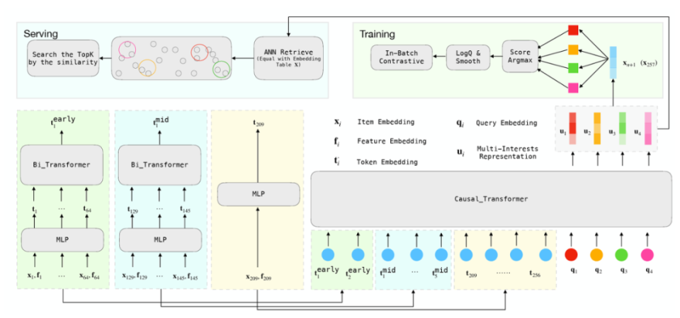 和 Meta GR 一样,KuaiFormer 也把过去“视推荐为分类问题”的做法改成了“把推荐视为预测用户的 next token”的问题,于是就可以利用 Transfomer 的结构预测用户的 next interest embedding,再把这些 embedding 当作 ANN 召回的索引 Embedding,就实现了 LLM 思想对召回层的改造。可以说,这类方案的核心是用训练 LLM 的思路解决推荐问题,用 Transformer 为基础的模型结构。