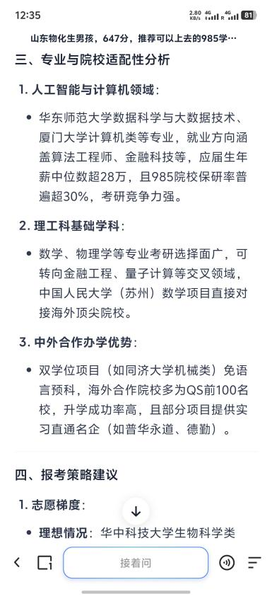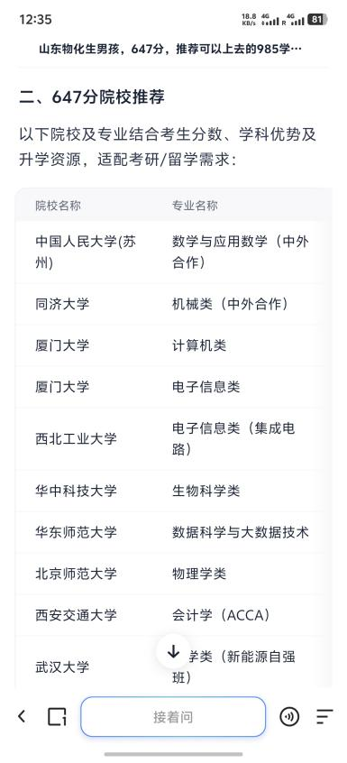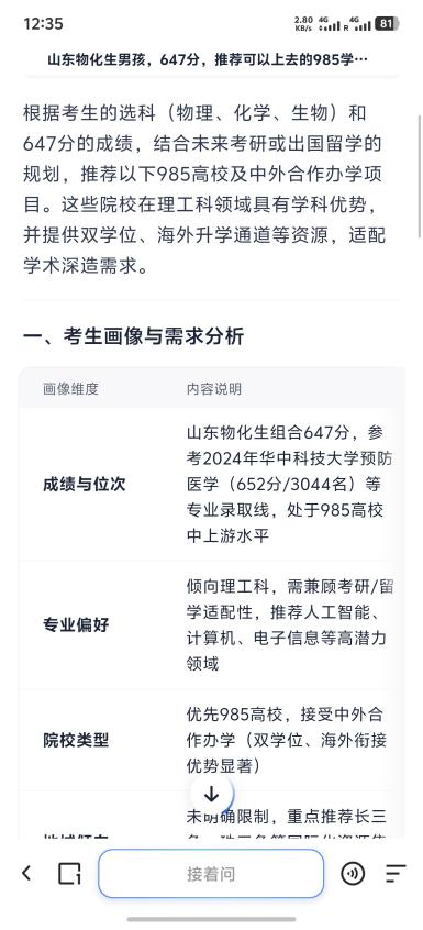 例如,笔者使用「山东物化生男孩,647 分,推荐可以上去的 985 学校,可以中外合作办学,以后想考研或者出国留学,做一下志愿填报」作为提示词,体验了一次高考深度搜索能力。