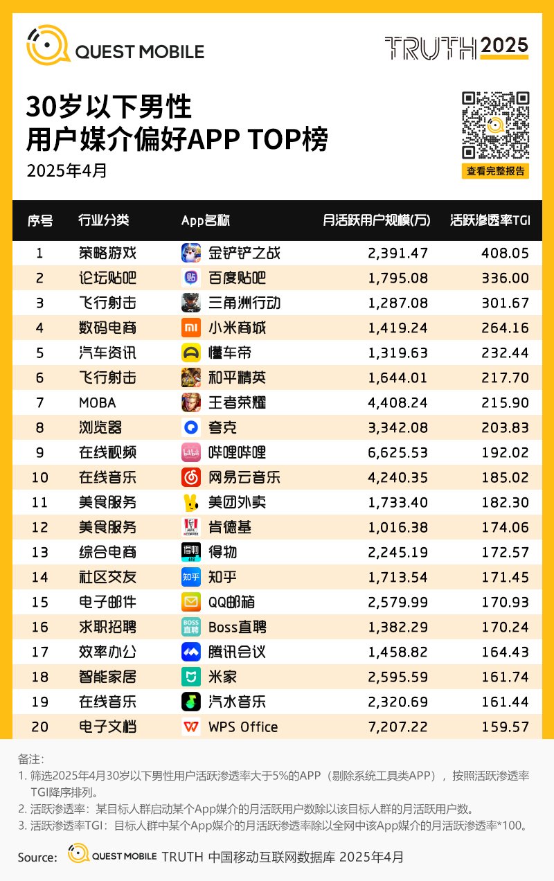 2、《金铲铲之战》《穿越火线:枪战王者》等游戏的30岁以下男性用户占比超50%,TOP10榜单中,7款手游的单日使用时长超过1小时3、年轻男性用户同时关注电竞赛事,愿意为优质游戏内容、周边产品及专业电竞设备消费,除手游外也是端游、主机游戏的核心玩家4、年轻男性用户更偏好使用得物、闲鱼、京东平台,热衷潮流单品、电子产品、小众二手圈层交易,手机消费上注重性价比、科技感与年轻化设计,更青睐小米、vivo、荣耀品牌5、“男颜经济”焕发活力,用户需求从基础护肤向彩妆、香氛等细分品类延伸,美妆品牌率先瞄准年轻男性用户,通过电竞、体育等垂直领域IP联动精准触达目标客群6、在运动健身领域,骑行文化在年轻男性群体中盛行,同时热衷于专业健身,对专业运动品牌有较高偏好![]()